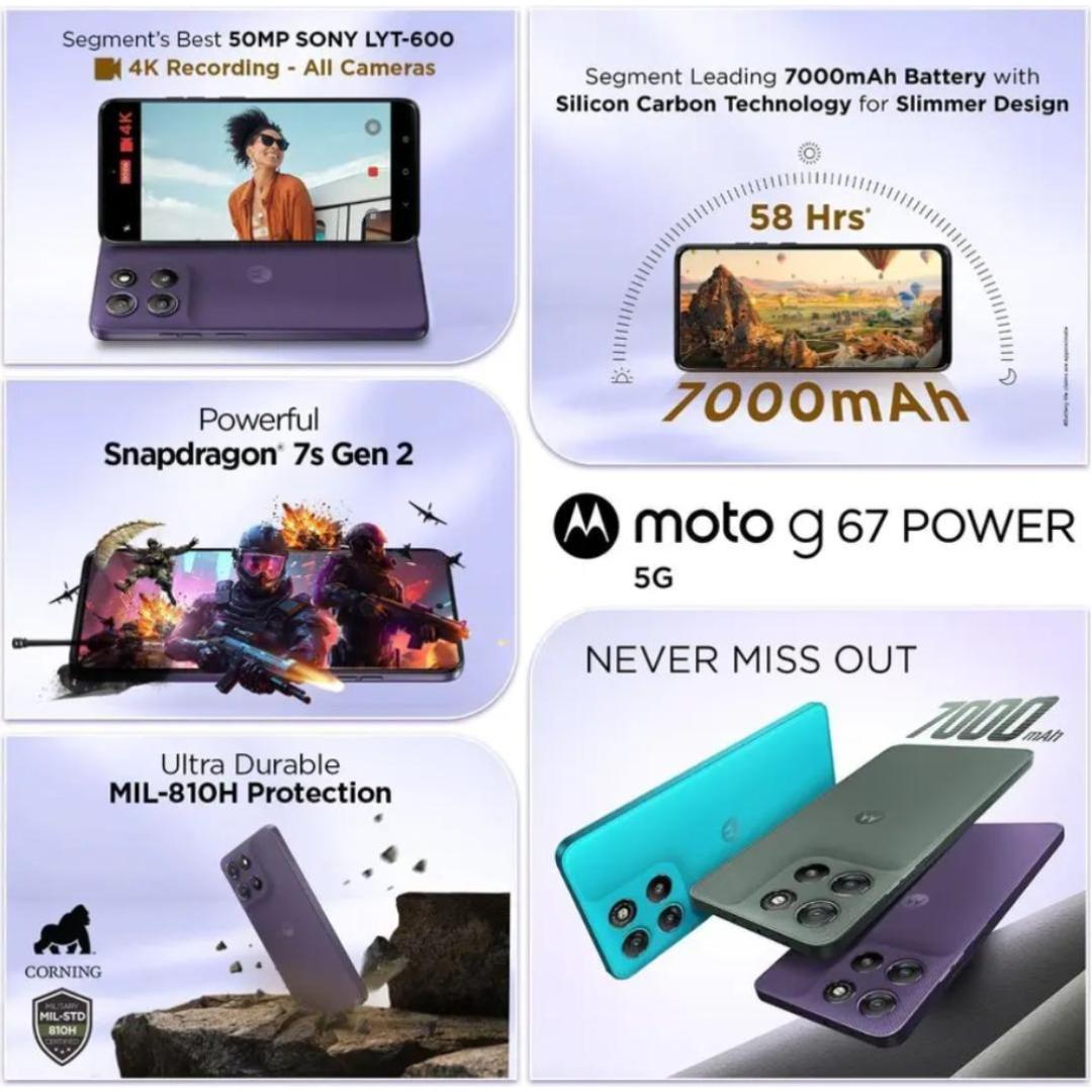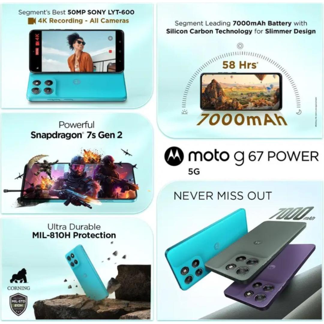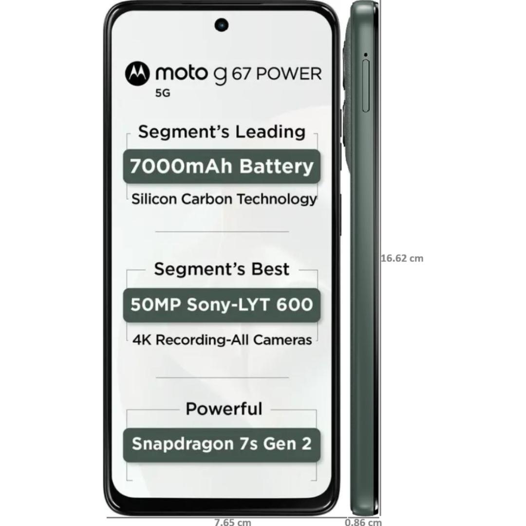 Moto G67 Power: Meet the Moto G67 Power, built for those who never want to miss out. Go longer with the segment’s leading 7000 mAh battery that lasts for up to 58 hours and is powered by Advanced Silicon Anode Technology. Known for capturing incredibly vivid photos with its 50MP Sony LYTIA 600 camera and recording every moment with ultra clear 4K video recording from all cameras. Enjoy seamless performance powered by the Snapdragon 7s Gen 2 processor. And it is available in 3 different Pantone-curated vegan leather designs. It is a complete POWERHOUSE with perfection.