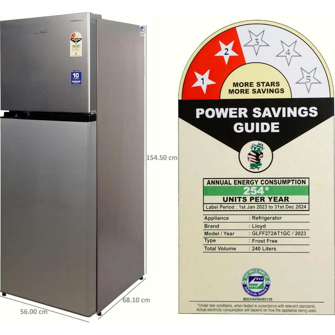 Lloyd 240L 2 Star Inverter Compressor : Uniform Cooling, Energy Efficient, Less Noise & More Durable (GLFF272AMST1GC , Metallic Silver)