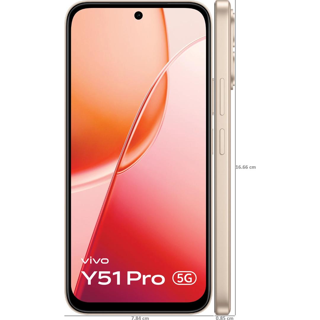 The vivo Y51 Pro 5G combines powerful performance, sleek metal design, and all-day battery life in one stylish package. Powered by the MediaTek Dimensity 7360-turbo processor and paired with fast RAM and ample storage options, this smartphone is built for smooth multitasking and reliable speed. Its 6.75-inch HD+ display features a 120Hz refresh rate and 1050 nits peak brightness, delivering clear, fluid visuals even under bright light. The 50MP + 2MP dual rear camera and 8MP front camera are enhanced with smart features like AI Erase and AI Photo Enhance, letting you capture and refine every moment with ease. With a military-grade certified build, massive 7200 mAh battery, 44W FlashCharge, dual stereo speakers, and the intuitive Funtouch OS 16 based on Android 16, the vivo Y51 pro 5G is engineered to deliver immersive entertainment and day-long performance—no matter which variant you choose. The Vivo Y51 pro 5G smartphone combines premium performance and exceptional durability, making it the perfect companion for your fast-paced lifestyle. Available in captivating Festive Red and Noble Gold, it offers stylish aesthetics to match your personality. Powered by advanced 5G technology, the Vivo Y51 pro ensures lightning-fast connectivity, seamless multitasking, and smooth streaming experiences. Choose between ample storage options of 128GB and 256GB to effortlessly store your favorite apps, photos, and videos. This smartphone features a robust build and superior durability designed for everyday resilience. With cutting-edge camera technology, capture stunning images and videos with remarkable clarity, even in low-light conditions. Experience immersive visuals on the vibrant display, enhanced by powerful processing capabilities for exceptional gaming and entertainment. Engineered for excellence, the Vivo Y51 pro 5G is your ideal choice for unmatched speed, reliability, and performance.