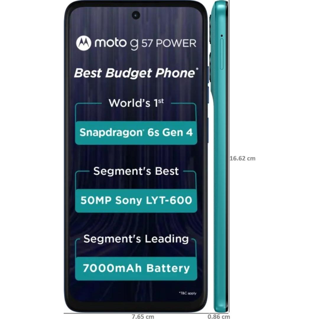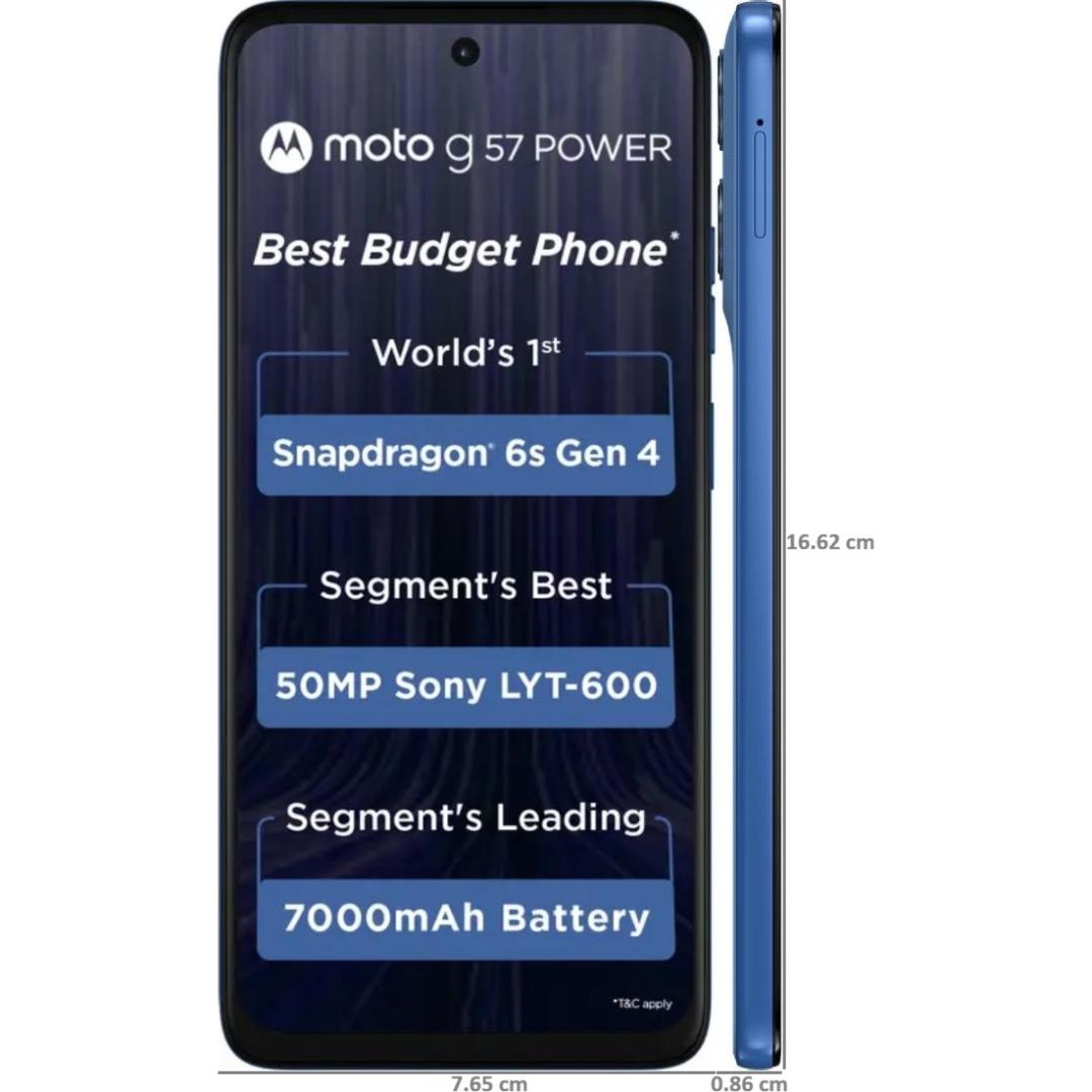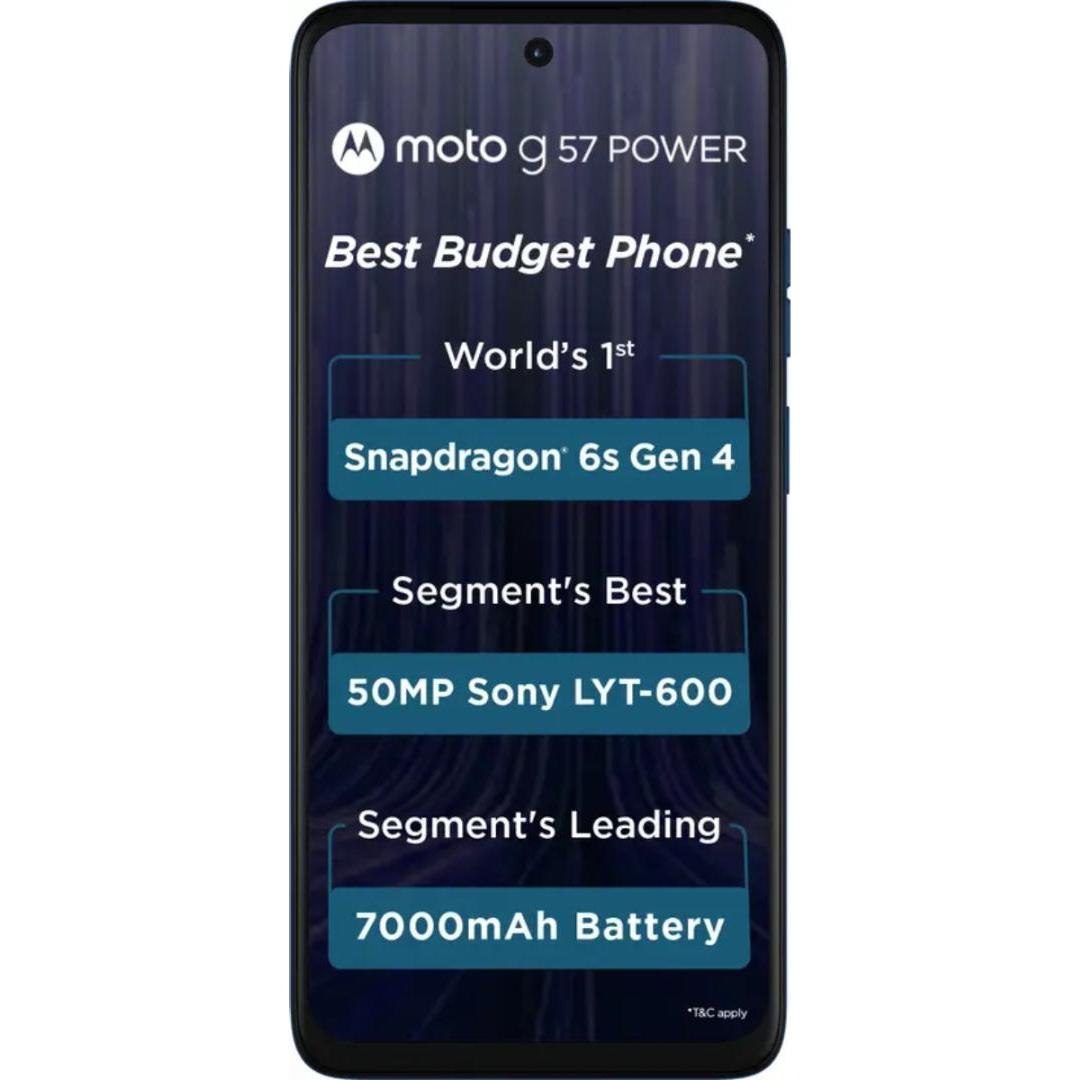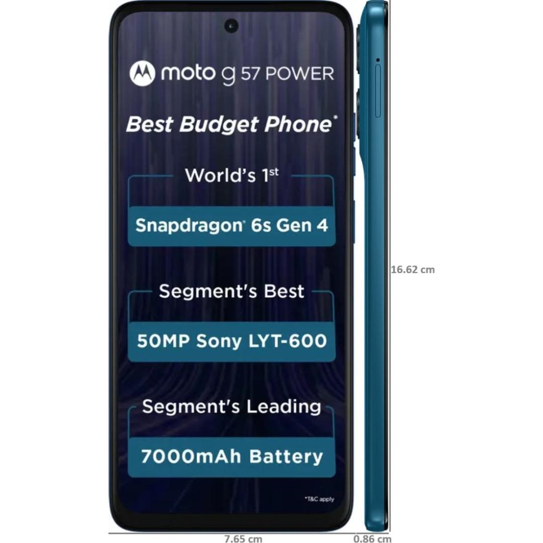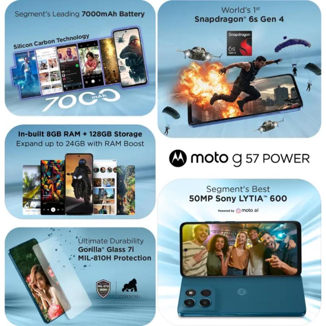 Moto G57 Power: The Moto G57 Power is built to keep up with everything you love doing. Powered by the latest Snapdragon 6s Gen 4 processor, every scroll, stream, and shot feels effortlessly fast. Capture stunning photos day or night with the segment's best 50 MP Sony LYTIA 600 camera powered by moto AI. And with its segment's leading 7000 mAh battery lasting up to 60 hours on a single charge, plus immersive FHD+120 Hz Display with Gorilla Glass 7i and military-grade durability, 3x better drop protection, and IP64 water resistance, power and protection are never a concern.