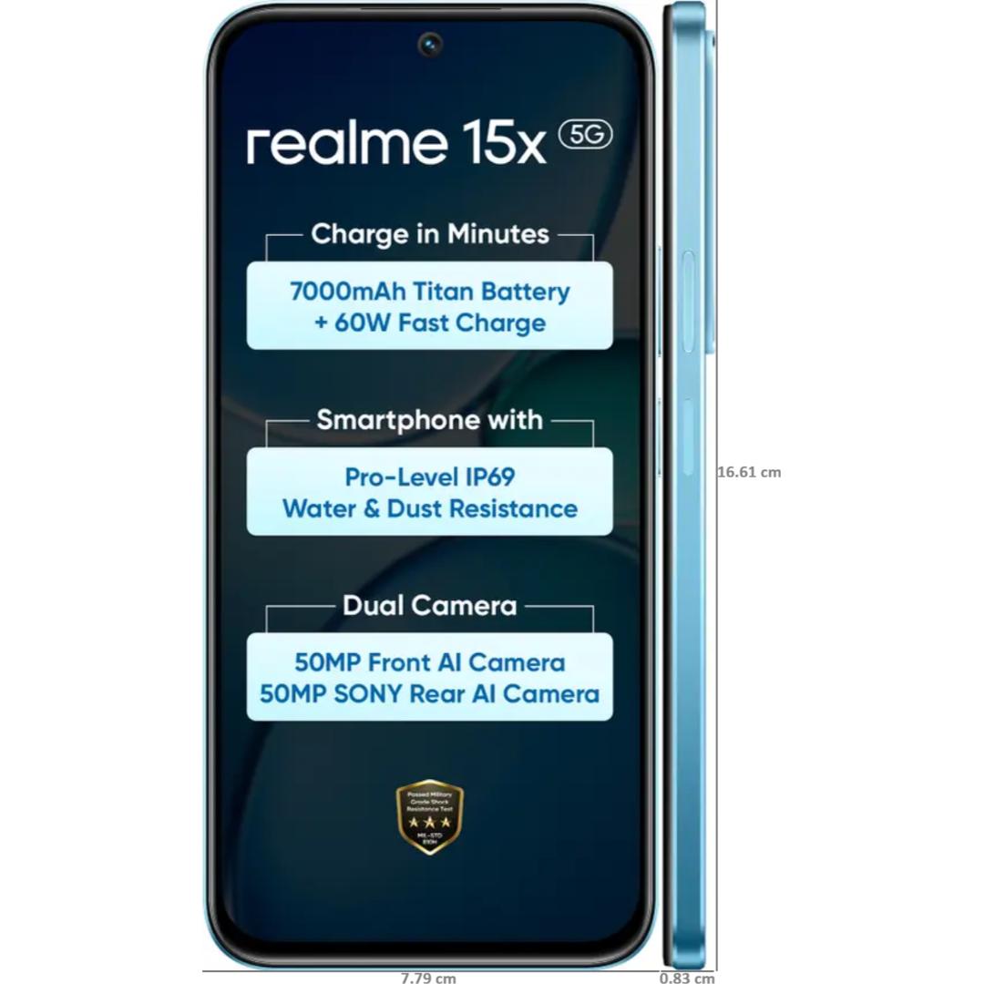 Realme 15x 5G 17.27 Centimeter (6.80) 50MP Sony IMX852 AI + 50MP WideAngle Dual Rear Camera 50MP Front Camera 144Hz 1200nit Ultra Bright HD+ Display MediaTek Dimensity 6300 6nm Octa Core Processor Smartphones Mobile